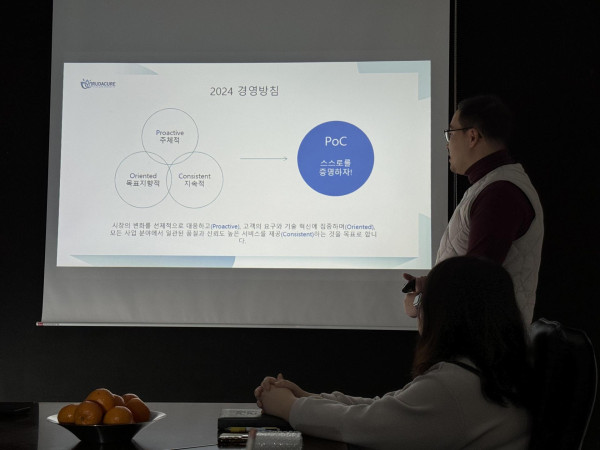 김용호 대표님의 신년사와 함께, [시장의 변화를 선제적으로 대응하고(Proactive), 고객의 요구와 기술 혁신에 집중하며(Oriented), 모든 사업 분야에서 일관된 품질과 신뢰도 높은 서비스를 제공하는 것을(Consistent) 목표로 스스로를 증명하자!] 는 컨셉 아래 2024 경영방침인 PoC(Proof of Concept)가 발표하였습니다. 이어지는 IR 공유 자리에서는 자사의 파이프라인과 미래 사업방향에 대한 설명과 함께 모두가 한 방향으로 나아가자는 의미를 전달하였습니다. 2024년 최종 목표는 Series B 투자 유치를 성공적으로 마치는 것으로 설정하였으며, 각 부서에서는 최종 목표에 도달하기 위해 팀별 목표를 공유하고 중요 이벤트에 대한 업무 협조를 조율하는 시간을 가지며 2024년의 전체적인 업무 흐름을 공유하는 시간을 가졌습니다.