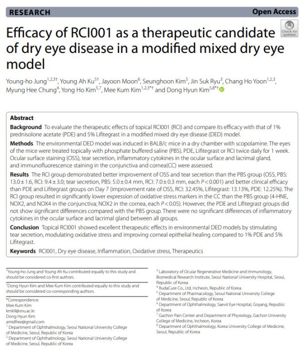 Efficacy of RCI001 as a therapeutic candidate of dry eye disease in a… 2026-01-22 0 48 01.22 14:16 헬스코리아 뉴스: 안암병원 김동현 교수 개발 ‘RCI001’ 안구건조증 치료에 효과적