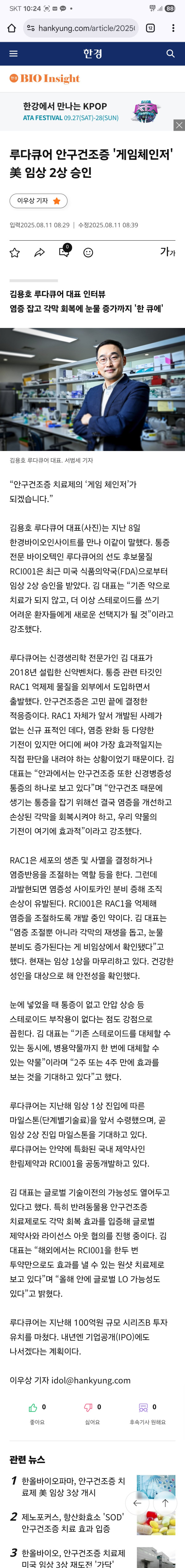 [한국경제] 루다큐어 안구건조증 '게임체인저' 미 임상 2상 승인 2026-01-22 0 54 01.22 15:14 [한국경제] 루다큐어 안구건조증 '게임체인저' 미 임상 2상 승인