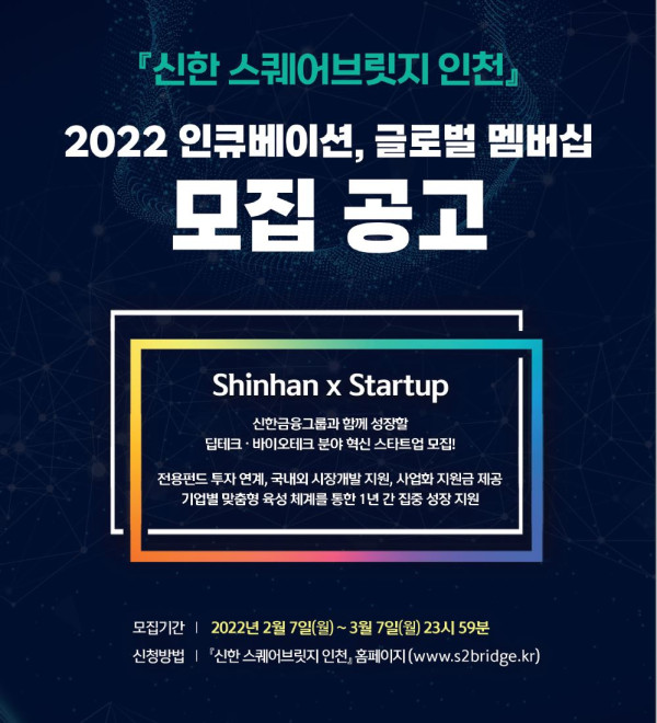 신한금융그룹이 인천광역시, 셀트리온, 구글 스타트업 캠퍼스와 함께, 딥테크, 바이오테크 기업의 성장을 지원하기 위한 신한 스퀘어 브릿지 인천에 글로벌 멤버십 사업에 선정 되었습니다.