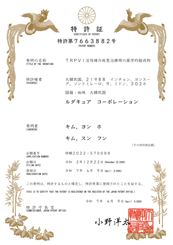 [특허] PATENT NUMBER 7663882 2026-01-23 0 27 01.23 17:43 2026.01.23 17:43 루다큐어_RCI002 용도 일본 특허_특허증.pdf (385.5K) + 0 내인성 단백질을 이용한 통증 치료 기술